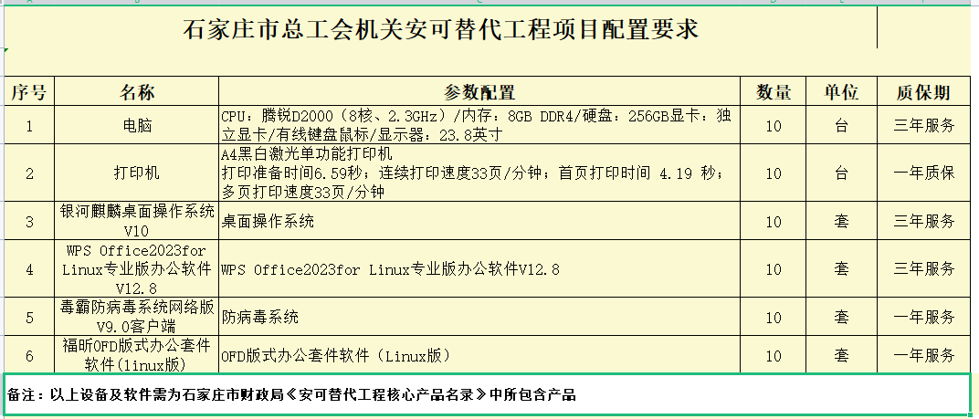 3.服务主要内容:采购10套机关办公所需的国产化电脑、打印机、操作系统、办公软件、杀毒软件等。配置要求附后